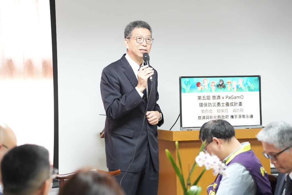 慈濟基金會熊士民副執行長表示,過去的數位學習是環保教育加上防災,現在是淨零永續。知識要落實在生活中,知行合一最重要的。[攝影者:鄭春金]