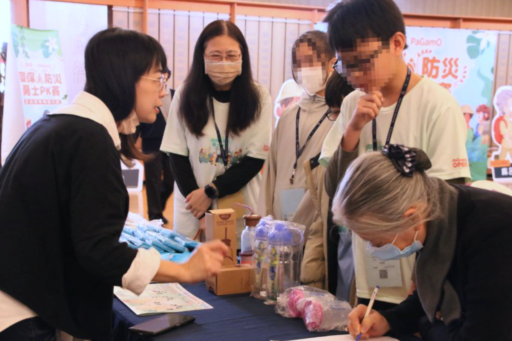 桌上擺放著一份《115年度新竹縣環境教育暨綠色消費推動執行計畫》簽到表,希望藉由與參賽學生及家長的互動交流,推廣綠色生活的理念。攤位上展示著各種實用的環保用品,包括環保筷、碗、杯、環保袋及環保檯燈等,她表示,今年新竹縣正積極在地方推動「淨零綠生活」計畫,希望透過多元方式讓民眾更了解環保與永續的重要性。