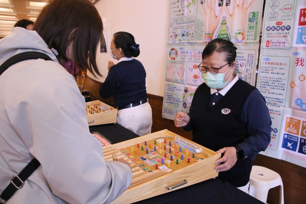 這座彈珠台遊戲結合環保教育與SDGs理念,讓孩子在遊戲中獲得樂趣的同時,也能學習環保與永續發展的相關知識。志工溫恩美(右)表示,如今地球環境污染日益嚴重,環保已成為每個人都必須重視的課題。「我們要愛護地球、愛護大地,大地健康了,人類才會健康。人類與大地是共生共存的。[攝影者:許鳳珠]