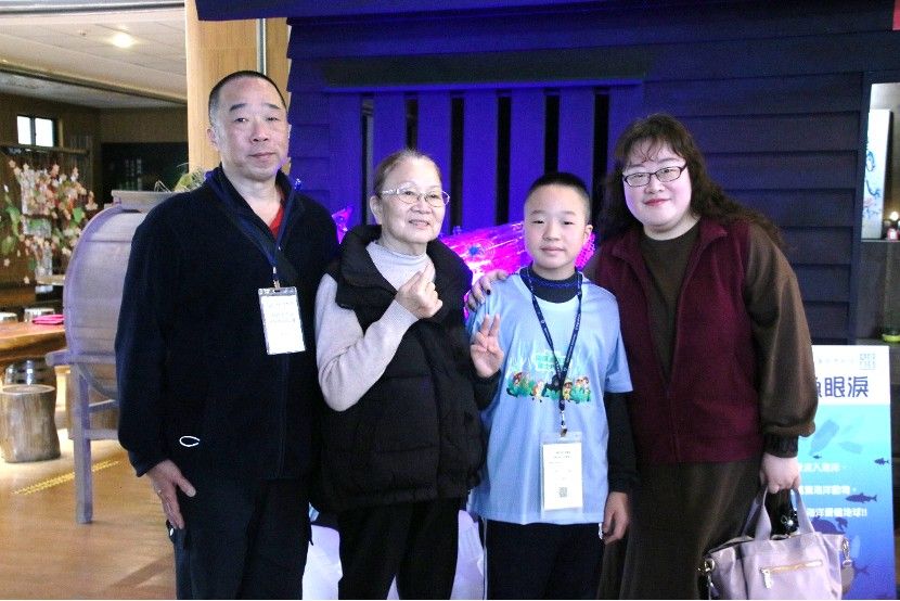 在PaGamO環保知識競賽現場,呂家一家三代爸爸呂宗育、奶奶呂陳新、孩子呂承軒、媽媽章嘉芙(由左至右),陪伴參賽,從奶奶到父母的身教陪伴,讓環保理念在家庭中自然傳承。[攝影者:林德文]