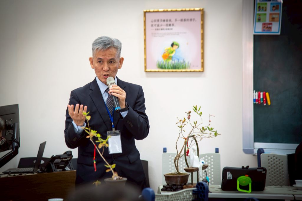 會場設置人文茶席,臺北志工洪秀緞帶領團隊以茶禮迎賓,茶香氤氳間,要讓校長與貴賓分享交流時,氣氛溫馨而自在。