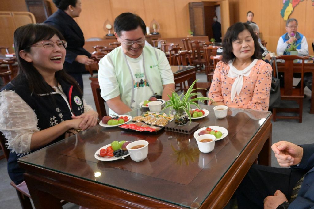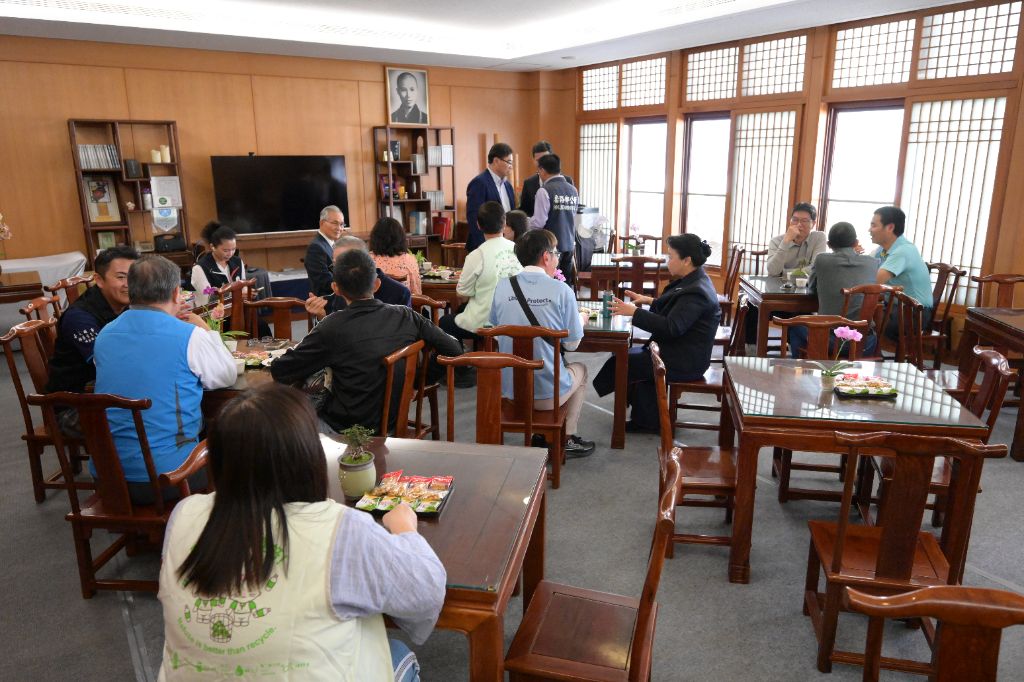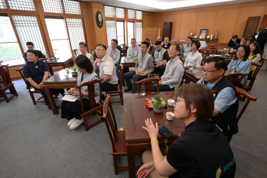 第五屆嘉義縣、市盃「PaGamO環保防災勇士PK賽」,(20260318)在嘉義聯絡處佛堂展開。而帶隊的各校校長、老師及各局處的長官,也在貴賓室進行一場溫馨的座談會,以茶會的方式,讓貴賓們彼此經驗交流 ,由慈濟志工嚴玉真校長主持。