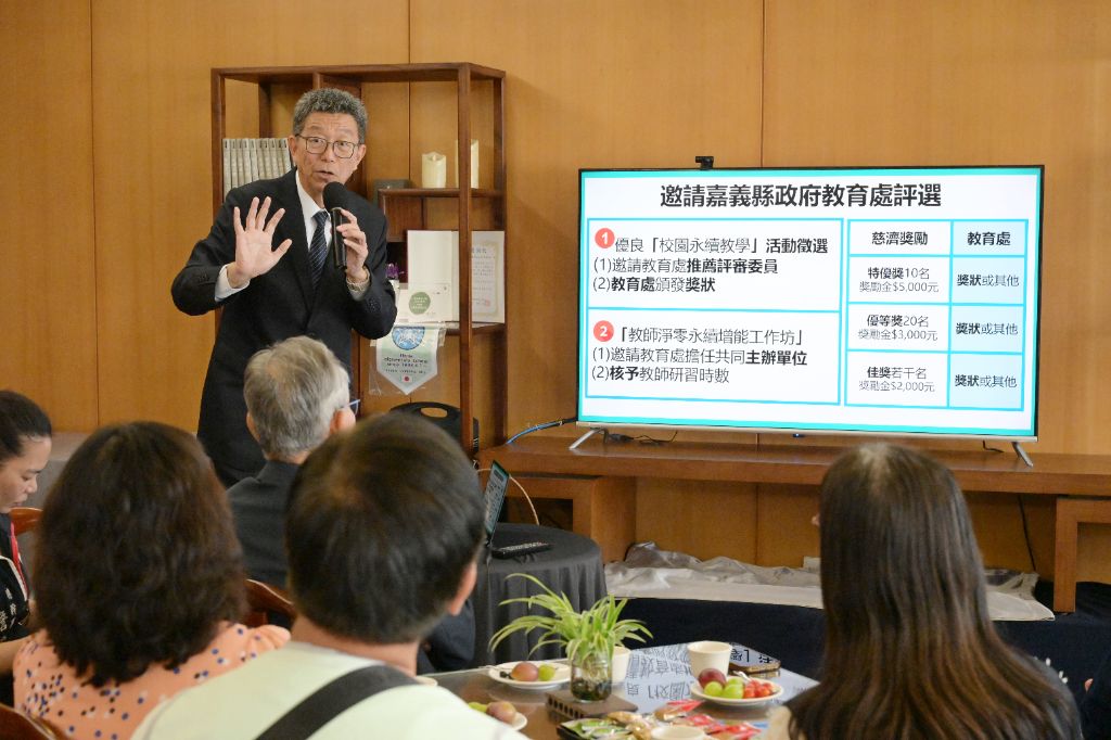 宗教處精實企劃室高專柳宗言和大家分享,攜手打造淨零永續校園:一、校園永續教學,二、教師淨零永續增能工作,三、無塑園遊會,環保校慶,四、環保畢旅,綠色旅遊,五、慈濟環保教育站,校外教學,六、慈濟環保教育車體驗。
