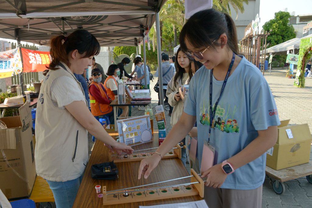環保局設計的「平衡滾珠臺」,透過兩條鐵軌控制滾球位置,讓孩子在遊戲中訓練專注與平衡能力。嘉大附小學生施佑蓁分享,遊戲過程讓她體會到,生活中一個小小的行動,都可能對地球造成影響,也讓她更加重視環境保護。
