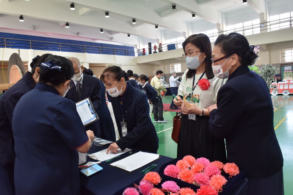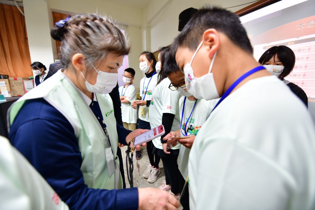 李碧浪(右)跟著志工蔡貞惠(中)、莊惠玲(左)三人一組,進入校園推廣環保防災勇士PK賽,最後共有十八所學校同意參加。[攝影者:吳碧華]