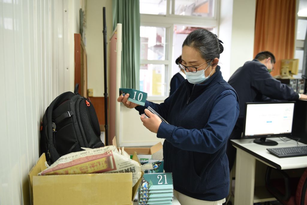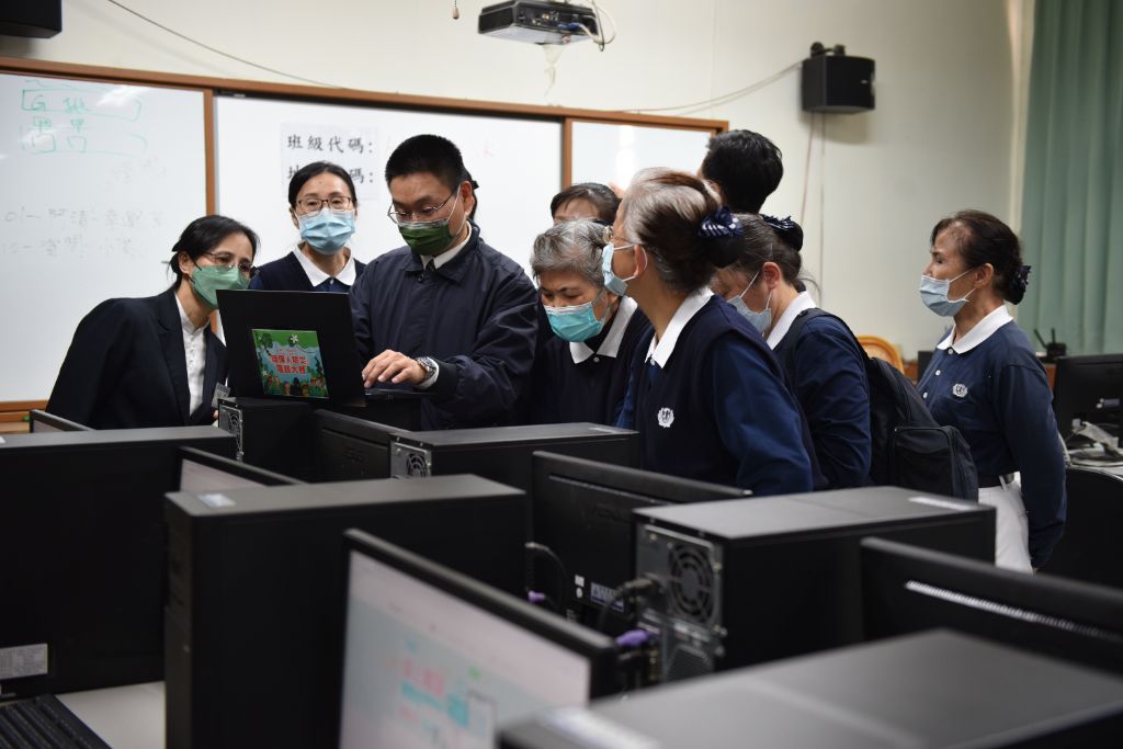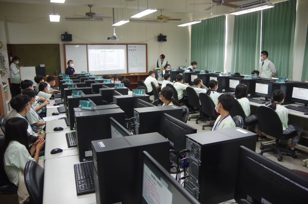 負責資訊教室競賽場地的慈濟志工為李碧浪、黃麗凌、董月春、楊憓雲,葉隆安;賽事組張涵鈞操作時,仔細地向志工們說明,並引導在電腦設定班級代碼及地圖密碼。志工黃麗凌邊登入邊練習輸入班級代碼等資料;楊憓蕓與董月春則邊操作邊討論登入事項。