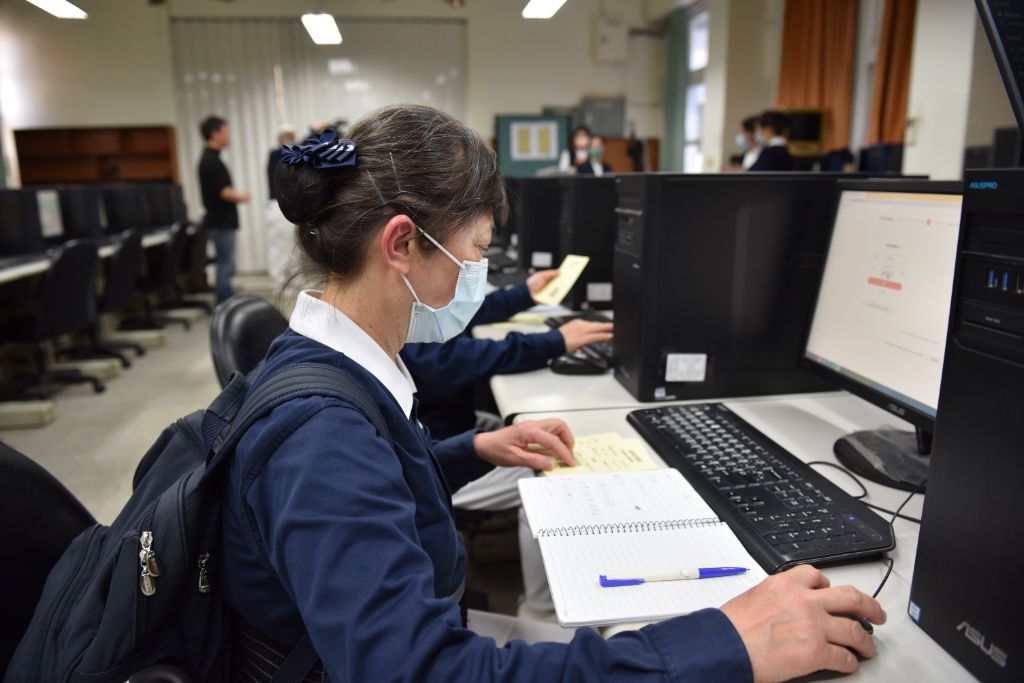 志工黃麗凌邊登入邊練習初賽A場-澎湖縣盃,班級代碼等資料。[攝影者:吳碧華]